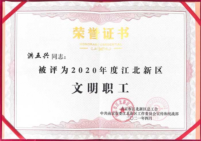 經(jīng)過(guò)江北新區(qū)總工會(huì)、江北新區(qū)工作委員會(huì)宣傳和統(tǒng)戰(zhàn)部的評(píng)選,洪五興榮獲“江北新區(qū)文明職工”